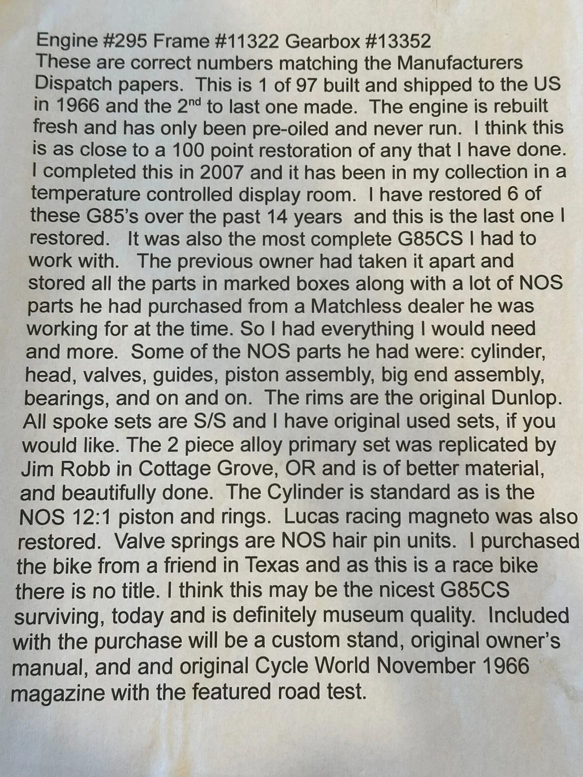 This is a very special motorcycle, 1 of 100 made, this was the last one produced and sent to the US. All matching frame, engine and gearbox numbers verified by VMCC factory records. Full restoration completed in 2007, engine has not been started since restored.