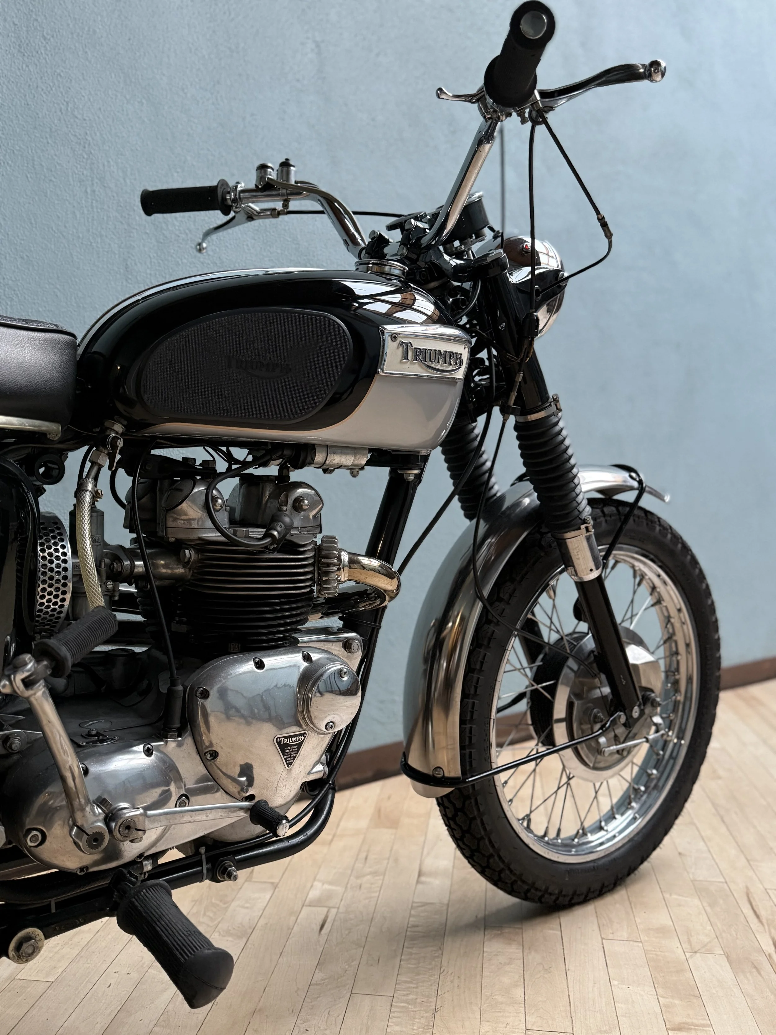 As a refined 500cc street scrambler, the 1970 Triumph T100C motorcycle delivers performance that rivals the TR6C Trophy 650, yet in a more compact package. Even with its center stand, the T100C remains impressively light at about 340 pounds (dry). Its single-carburetor 490cc parallel-twin engine produces 38 horsepower at 7,000 rpm, offering brisk, responsive acceleration. (A test of the dual-carburetor T100R Daytona the previous year records a top speed of 107 mph.) With a 53.5-inch wheelbase, the T100C is exceptionally agile, while its 18-inch wheels and 3.25-inch knobby tires lend it a confident, purposeful stance.